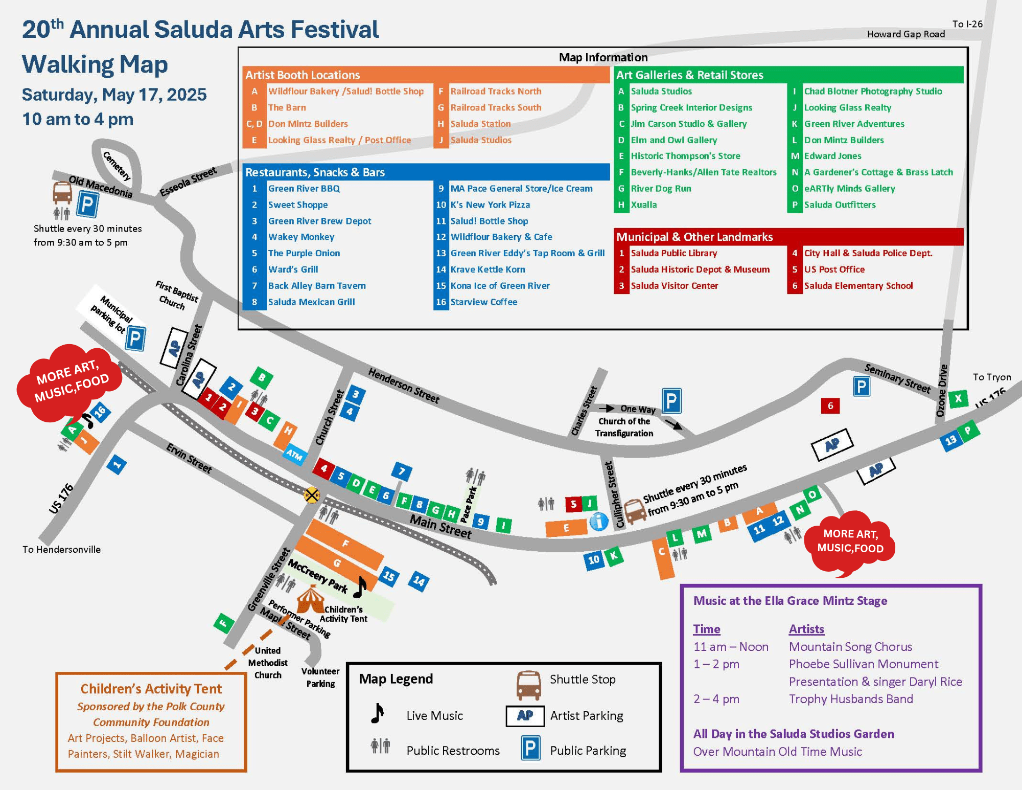 This year’s festival features new event parking in the field next to Saluda Cemetery, courtesy of Clark, Pam, and Jonathan Thompson. Shuttles will run all day to and from the lot. Parking also is available in the municipal lot on East Main Street, Saluda Elementary School, and anywhere else parking is permitted. (NOTE: Our Police Department, as well as our neighbors, ask everyone not to block private streets, lots, or driveways.) Signs will show the way to parking areas and shuttle stops.